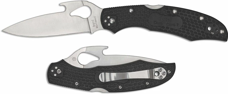 The BY03PBK2W Spyderco Byrd Cara Cara 2 Emerson Opener Knife is a value priced everyday carry that features a 3.75 inch drop point blade made of 8Cr13MoV stainless steel, .118 inch thick, with a full flat grind, a notched choil and thumb ramp for secure grip, the Spyderco hole and the Emerson Opener for ambidextrous one hand opening (and for open on withdrawal). The ergonomic black FRN (fiberglass reinforced nylon) handle, 4.83 inches closed, has Bi-Directional Texturing for secure purchase, skeletonized stainless steel liners, sturdy lockback, a lanyard hole, and a 4 position steel pocket clip. The Spyderco Byrd Cara Cara 2 Emerson Opener Knife has an overall open length of 8.55 inches and it weighs 3.1 ounces. Made in China.