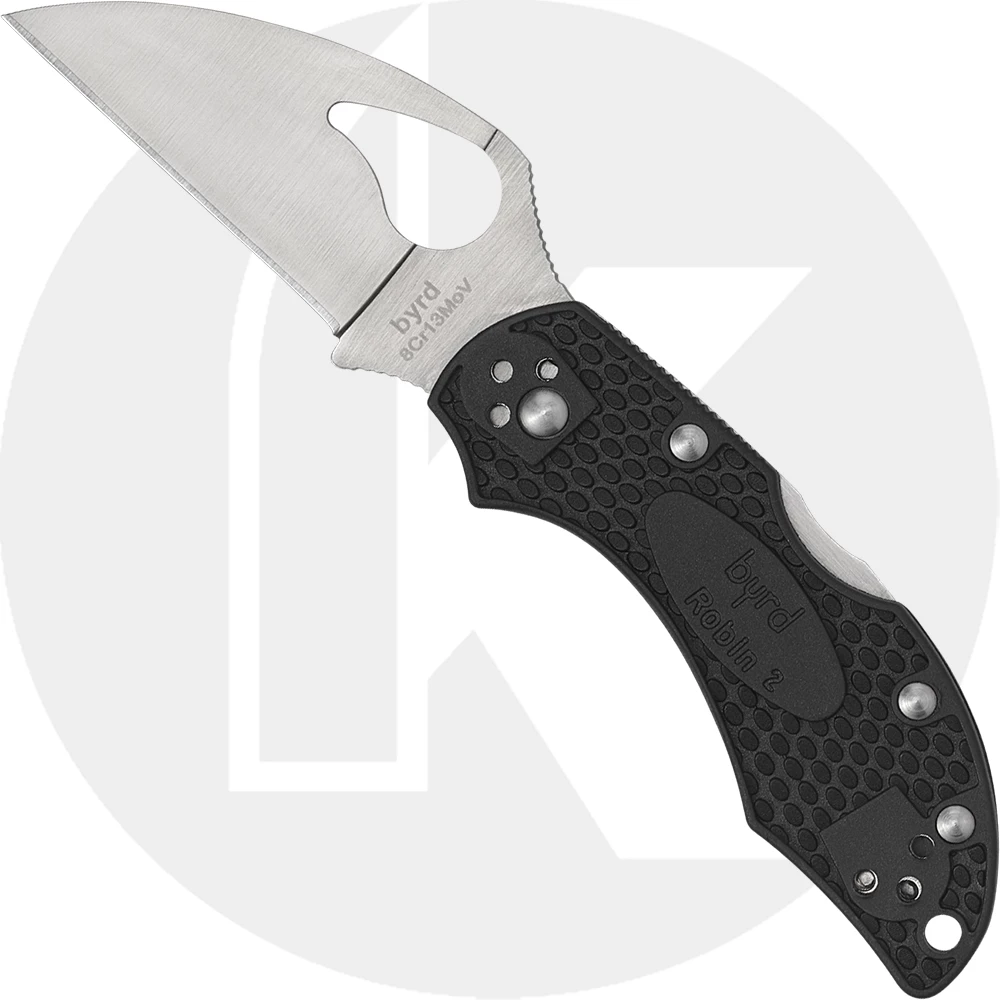 The BY10PBKWC2 Spyderco Robin 2 Wharncliffe Byrd Knife is a value priced everyday carry that features a 2.35 inch Wharncliffe blade made of 8Cr13MoV stainless steel, .098 inches thick, with a full flat grind, a notched choil and thumb ramp for secure grip, and a hole for ambidextrous one hand opening. The black FRN (fiberglass reinforced nylon) handle, 3.30 inches closed, has ergonomic contours and texturing for secure purchase, sturdy back lock, lanyard hole, and a 4 position metal pocket clip. The Spyderco Byrd Robin 2 Wharncliffe Knife has an overall open length of 5.65 inches, and it weighs 2.0 ounces. Made in China.