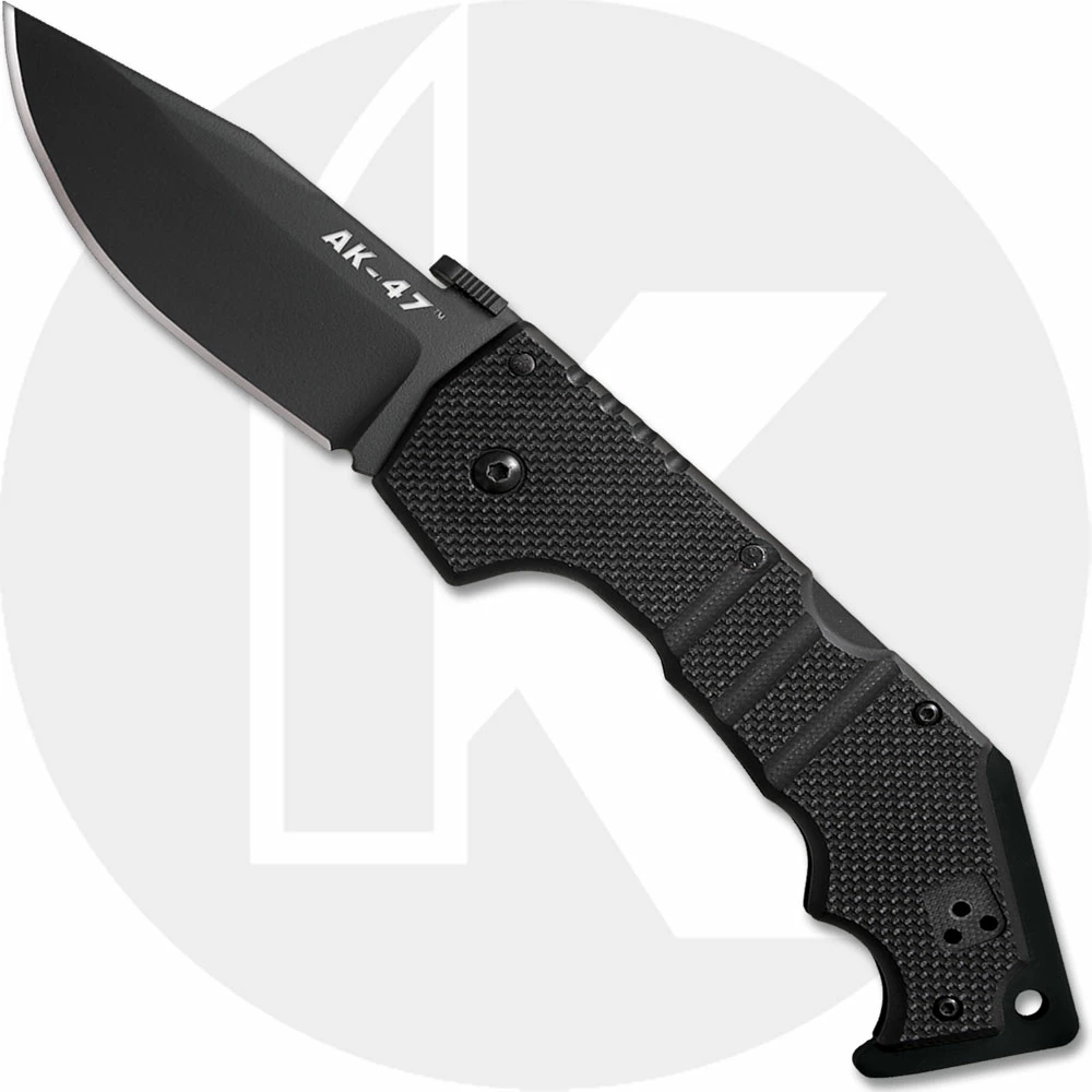 The Cold Steel AK-47 with S35VN blade steel! The 58M Cold Steel AK-47 Knife, designed by Andrew Demko, features a 3 1/2 inch clip point blade made of S35VN stainless steel, 3.5mm thick, with a non reflective black DLC coat, and patented thumb plate for ambidextrous one hand opening, as well as open on withdrawal (by snagging on the pocket edge). The grooved black G10 handle, 5 1/2 inches closed, has the sturdy Tri-Ad Lock, an extended pommel with integral lanyard hole, and an ambidextrous pocket clip mounted at the butt end. The Cold Steel AK-47 Knife has an overall open length of 9 inches, and it weighs 5.3 ounces. Made in Taiwan.