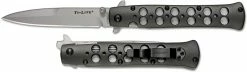 From Cold Steel: This classic sub-hilt design fighter was first developed by Bob Loveless, one of the founding members of the knifemaker’s guild. It’s perhaps the quintessential combat knife. Its 8″ blade offers excellent reach and incredible penetration with very little physical effort. The sub hilt practically eliminates the possibility of the hand being dislodged or coming into contact with the blade. Plus, the sub hilt facilitates rapid and effortless withdrawal after insertion. The VG-10 San Mai III® blade is perfectly heat treated and a double grind is expertly applied. Then the surface of the blade is polished to a beautiful satin finish and the edges are honed and buffed to hair shaving sharpness! The black G10 scales are fastened to the blade tang by 6 stainless pins and expertly hand shaped and contoured.