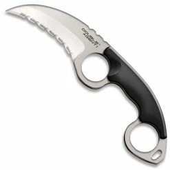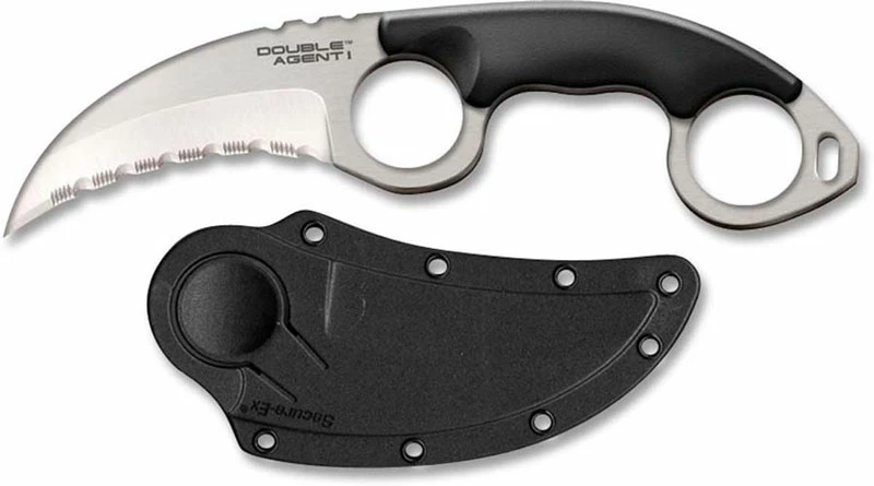 The illustrated Cold Steel Knife is the Cold Steel Double Agent I Knife that features a 3″ serrated hawkbill fixed blade made of Japanese AUS8A stainless steel, 2.3mm thick. The blade of this Cold Steel knife has a notched thumb rest for secure grip. The Double Agent I Knife has full tang construction, with black Griv-Ex scales, two finger holes and a lanyard hole. A Secure-Ex neck sheath is included with this Cold Steel knife. The Cold Steel Double Agent I Knife with serrated blade has an overall length of 7 7/8″, and weighs 2.5 ounces.