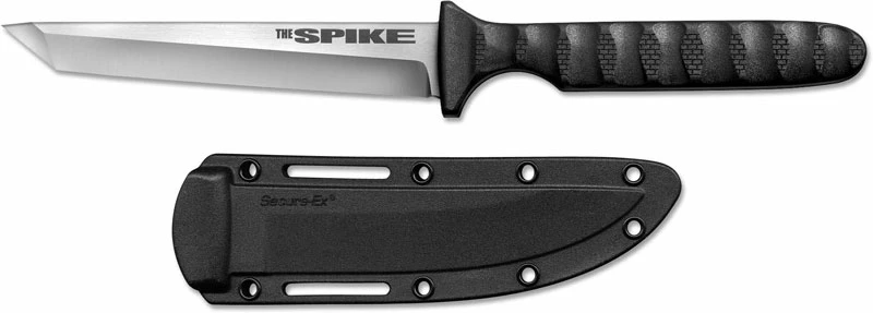 The illustrated Cold Steel knife is the Cold Steel Tanto Spike knife that features a 4″ tanto fixed blade made of German 4116 stainless steel, 3mm thick. The black Griv-Ex handle of this Cold Steel knife has texture grooves for secure grip. A Secure-Ex neck sheath with bead chain lanyard is included with this Cold Steel knife. The Cold Steel Tanto Spike knife has an overall length of 8″, and it weighs 2.3 ounces.