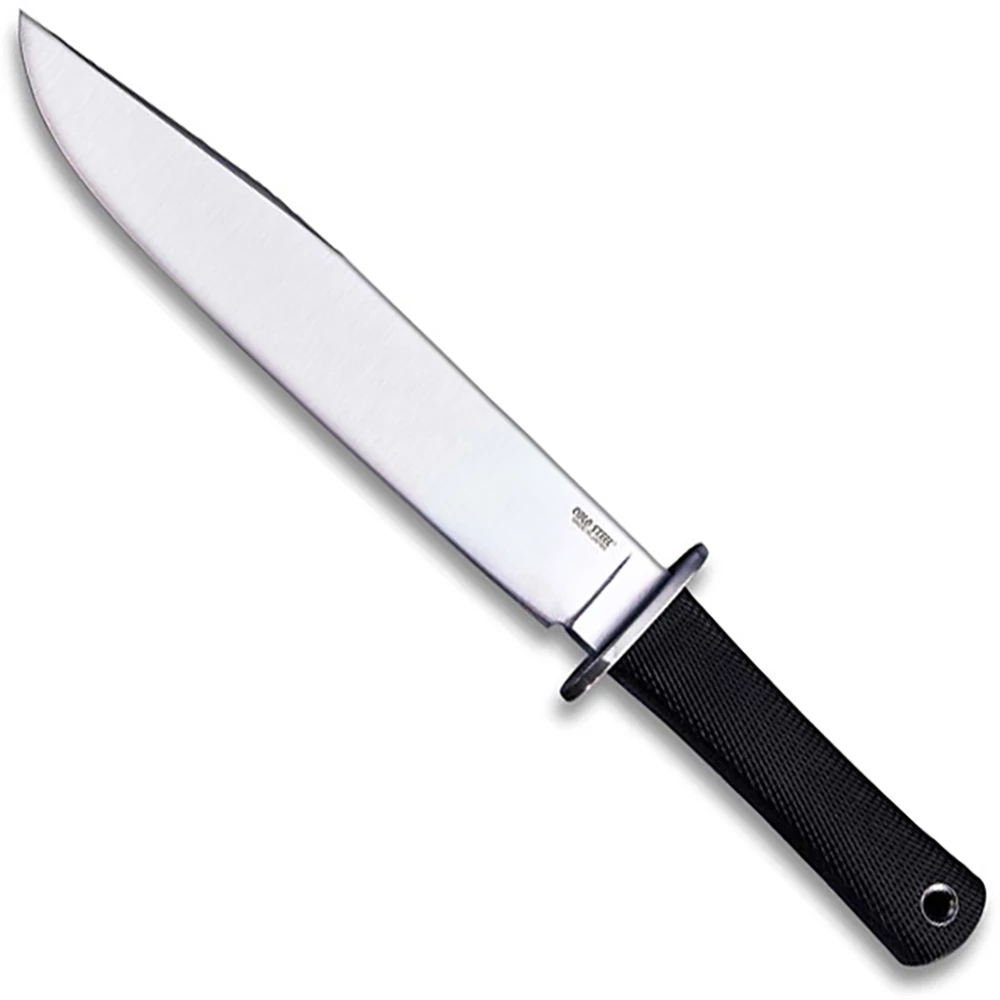 The illustrated Cold Steel Knife is the San Mai Cold Steel Trail Master Knife that features a 9 1/2″ clip point bowie fixed blade made of VG1 San Mai III steel, 5/16″ thick. The black Kray-Ex handle of this Cold Steel Knife has texturing for secure grip, a stainless steel guard and a lined lanyard hole. A black Cor-Ex sheath is included with this Cold Steel Knife. The Cold Steel Trail Master Knife with San Mai blade has an overall length of 14 1/2″, and it weighs 17.5 ounces.