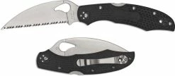 The illustrated Cold Steel knife is the Cold Steel Tuff Lite knife that features a 2 1/2″ serrated modified Wharncliffe blade made of Japanese AUS8A stainless steel, 2.75mm thick. The blade of this Cold Steel knife has a notched thumb rest for secure grip and an oval hole for ambidextrous one hand opening. The finger grooved black Griv-Ex handle, 3 1/2″ closed, has the Tri-Ad Lock and a lanyard hole. A removable stainless steel pocket clip is mounted at the pivot end of this Cold Steel knife. The Cold Steel Tuff Lite knife with serrated blade has an overall length of 6″ when open, and it weighs 2.5 ounces.