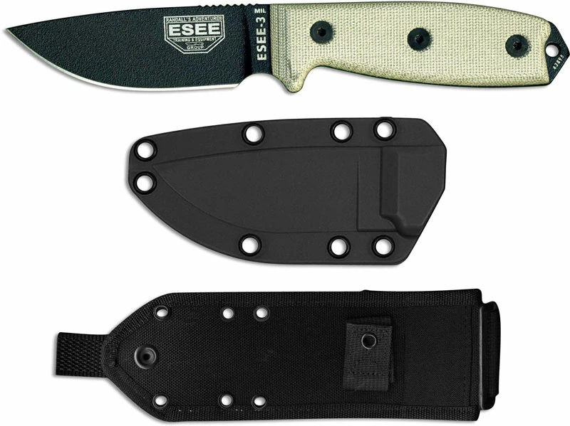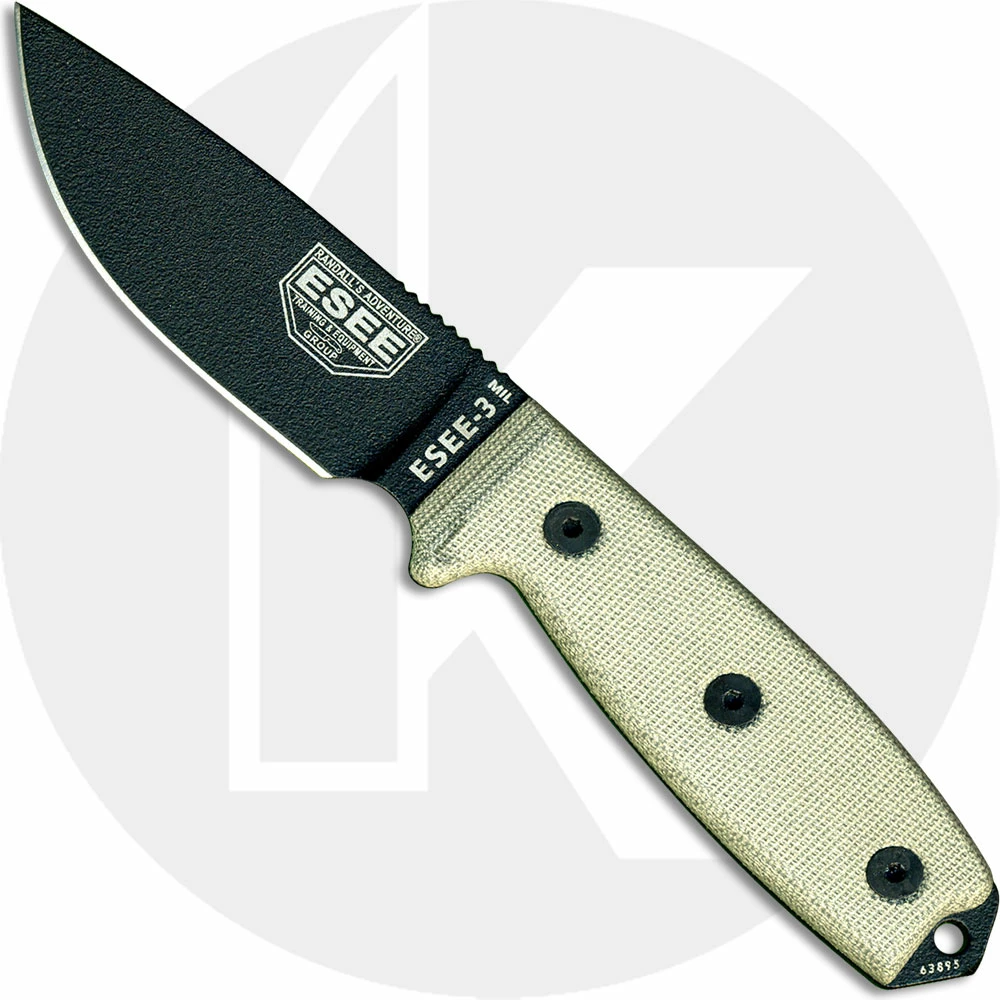 The ESEE-3 is a classic slim profile ESEE EDC favored by Law Enforcement and military units far and wide. The ESEE-3MIL-P-B is a variant that features a 3.88 inch drop point fixed blade made of 1095 carbon steel, with a maximum thickness of .125 inch, a Rockwell hardness of 55-57, a 3.38 inch cutting edge, a flat grind, a notched thumb rest for secure grip, the ESEE logo and a non reflective black powder coat finish. The ESEE-3MIL-P-B has full tang construction for strength; canvas Micarta scales for comfort, and an extended glass breaker pommel with integral lanyard hole. A black molded sheath with MOLLE back is included. The ESEE-3MIL Knife has an overall length of 8.31 inches, and it weighs 5.2 ounces without the sheath. Made in the USA.