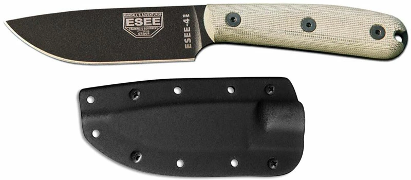 The ESEE-4HM marries the traditional ESEE-4 blade to a traditional handle. The ESEE-4HM-K features a 4.38 inch drop point fixed blade made of 1095 carbon steel, with a maximum thickness of .188 inch, a Rockwell hardness of 55-57, a 4.13 inch cutting edge, a flat grind, the ESEE logo and a non reflective black powder coat finish. The ESEE-4HM-K has full tang construction for strength; canvas Micarta scales for comfort, and a lanyard hole. A black Kydex sheath with clip plate is included. The ESEE-4HM-K Knife has an overall length of 8.88 inches, and it weighs 7.7 ounces without the sheath. Made in the USA.