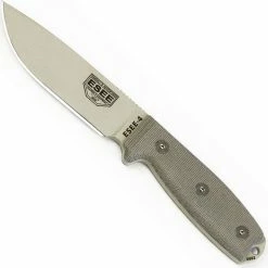 The ESEE-4 is a big brother of the iconic ESEE-3, and a popular ESEE EDC workhorse in its own right. The ESEE-4P-DT features a 4.5 inch drop point fixed blade made of 1095 carbon steel, with a maximum thickness of .188 inch, a Rockwell hardness of 55-57, a 4.1 inch cutting edge, a flat grind, a notched thumb rest for secure grip, the ESEE logo and a non reflective Desert Tan powder coat finish. The ESEE-4P-DT has full tang construction for strength; canvas Micarta scales for comfort, and a curved pommel with integral lanyard hole. An Olive Drab molded sheath with clip plate is included. The ESEE-4 Knife has an overall length of 9.0 inches, and it weighs 8.0 ounces without the sheath. Made in the USA.