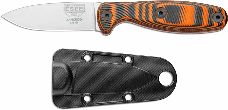 The XAN2-006 ESEE Xancudo features a 3.0 inch spear point fixed blade made of S35V stainless steel, with a maximum thickness of .125 inch, a Rockwell hardness of 59-60, a flat grind, a notched thumb rest for secure grip, the ESEE logo and a stonewash finish. This Xancudo XAN2-006 has full tang construction for strength, and solid orange / black 3D G10 scales for comfort and secure purchase. A black molded sheath is included. The Xancudo Knife has an overall length of 7.12 inches, and it weighs 3.8 ounces; 6 ounces with the sheath. Made in the USA.