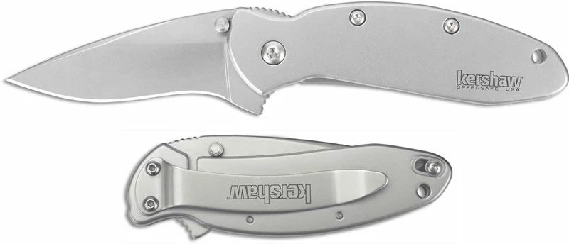 The illustrated Kershaw knife is the Frame Lock Scallion Knife that features a 2 1/4″ blade made of 420HC stainless steel with bead blast finish. The blade of this Kershaw knife has dual thumb studs, ambidextrous Index Open System and SpeedSafe assist for ambidextrous one hand opening. The bead blasted stainless steel handle, 3 1/2″ closed, has a frame lock, a blade safety and a lanyard hole. A metal pocket clip is mounted at the pivot end of this Kershaw knife. The Kershaw Scallion knife with stainless steel frame lock handle has an overall length of 5 3/4″ when open and weighs 2.3 ounces. Made in the USA.