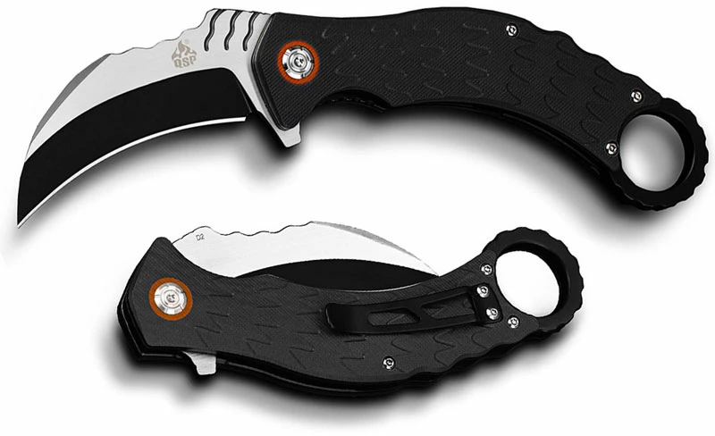 The QS120-A QSP Eagle Karambit Knife is a value price self defence EDC that features a 3.125 inch hawkbill blade made of Chinese D2 tool steel with a two tone satin and black finish, a notched thumb rest for secure grip, and a flipper for ambidextrous one hand opening. The black G10 handle, 5.375 inches closed, has eagle feather texturing for secure purchase, ceramic ball bearing pivot for smooth opening, stainless steel liners for strength, a sturdy liner lock, steel backspacer that transitions into a traditional ring pommel, and a removable steel pocket clip mounted at the butt end. The QSP Eagle Knife has an overall open length of 8.00 inches, and it weighs 5.2 ounces. Made in China.