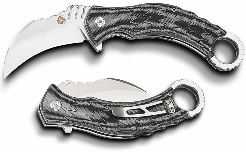 The QS120-E QSP Eagle Karambit Knife is a value price self defence EDC that features a 3.125 inch hawkbill blade made of Chinese D2 tool steel with a satin finish, a notched thumb rest for secure grip, and a flipper for ambidextrous one hand opening. The black and gray G10 handle, 5.375 inches closed, has eagle feather texturing for secure purchase, ceramic ball bearing pivot for smooth opening, stainless steel liners for strength, a sturdy liner lock, steel backspacer that transitions into a traditional ring pommel, and a removable steel pocket clip mounted at the butt end. The QSP Eagle Knife has an overall open length of 8.00 inches, and it weighs 5.2 ounces. Made in China.