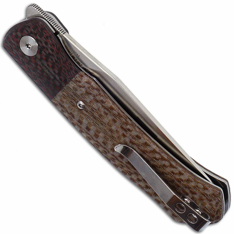 The QS137-B QSP Gannet Knife is an eyecatching EDC that features a 3.375 inch clip point blade made of 154CM stainless steel with a satin finish and a notched flipper tang for ambidextrous one hand opening. The brown linen micarta handle, 4.50 inches closed, has a red carbon fiber bolster for visual interest, ceramic ball bearing pivot for smooth opening, stainless steel liners for strength, a sturdy liner lock and a removable deep carry steel pocket clip mounted at the butt end. This QSP Gannet Knife has an overall open length of 7.875 inches, and it weighs 3.50 ounces. Made in China.