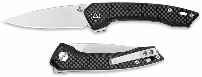 The QS135-A QSP Leopard is a sleek gent’s size value price EDC that features a 3.25 inch drop point blade made of Sandvik 14C28N stainless steel, .12 inch thick, with a 3 inch cutting edge, a satin finish, notched thumb rest for secure grip, and a low profile flipper for ambidextrous one hand opening. The ergonomic black G10 handle, 4.25 inches closed, has a black carbon fiber overlay for visual interest, pivot with ceramic ball bearing support for smooth opening, stainless steel liners and a notched back spacer for strength, liner lock, lanyard hole and a stainless steel pocket clip mounted at the butt end. The QSP Leopard Knife with G10 and carbon fiber handle has an overall open length of 7.25 inches, and it weighs 3.1 ounces. Made in China.