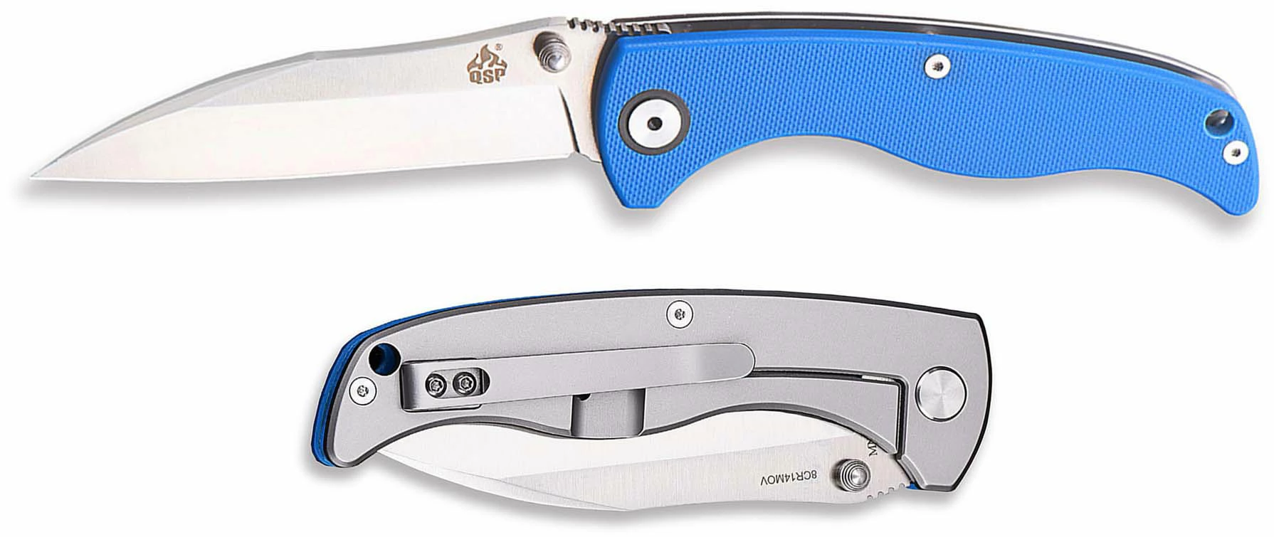 The QS110-B QSP Nokomis is a value price EDC, designed by Clay Mewes, that features a 3.75 inch Wharncliffe blade made of 8Cr14MoV stainless steel with a two tone stonewash and satin finish, a swedged tip, a notched thumb ramp for secure grip, and dual thumb studs for ambidextrous one hand opening. The ergonomic handle, 4.50 inches closed, has a blue G10 front, stainless steel back with frame lock, a lanyard hole, and a stainless steel pocket clip mounted at the butt end. The QSP Nokomis Knife has an overall open length of 8.25 inches, and it weighs 4.6 ounces. Made in China.
