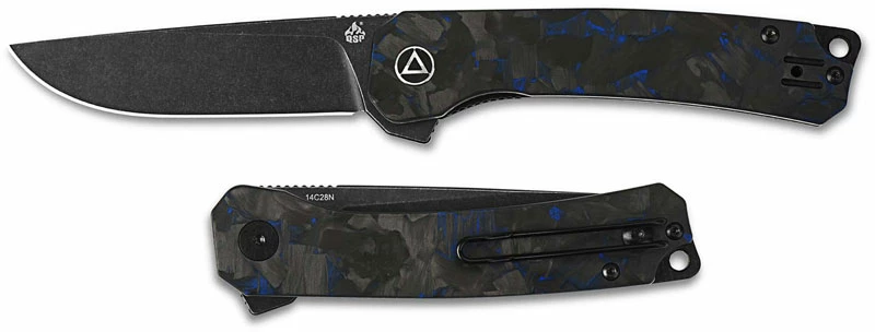 The QS139-G2 QSP Osprey is a sleek value price EDC that features a 3.25 inch classic drop point blade made of 14C28N stainless steel, 3mm thick, with a Rockwell hardness of 58-60, black stonewash finish, notched thumb rest for secure grip, and a flipper for ambidextrous one hand opening. The eyecatching ergonomic shredded black and blue carbon fiber overlay G10 handle, 4.25 inches closed, has a pivot with ceramic ball bearing support for smooth opening, sturdy liner lock, stainless steel liners and back spacer (with integral lanyard hole) for strength, and a side to side reversible wire clip mounted at the butt end. This QSP Osprey Knife has an overall open length of 7.5 inches, and it weighs 3.5 ounces. Made in China.