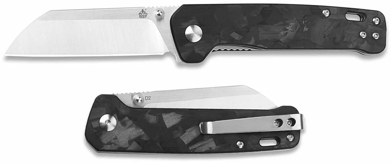The QS130-T QSP Penguin is a compact value price everyday carry knife that features a 3.06 inch sheepfoot blade made of Chinese D2 tool steel, 3mm thick, with a Rockwell hardness of 58-60, two tone satin finish, a notched thumb rest for secure grip, and dual thumb studs for ambidextrous one hand opening. The eye catching shredded black carbon fiber overlay G10 handle, 4.00 inches closed, has stainless steel liners for strength, sturdy liner lock, a lanyard hole and a side to side reversible deep carry stainless steel pocket clip mounted at the butt end. This QSP Penguin Knife has an overall open length of 7.06 inches, and it weighs 3.39 ounces. Made in China.