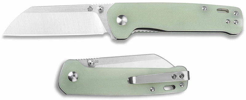 The QS130-V QSP Penguin is a compact value price everyday carry knife that features a 3.06 inch sheepfoot blade made of Chinese D2 tool steel, 3mm thick, with a Rockwell hardness of 58-60, two tone satin finish, a notched thumb rest for secure grip, and dual thumb studs for ambidextrous one hand opening. The jade G10 handle, 4.00 inches closed, has stainless steel liners for strength, sturdy liner lock, a lanyard hole and a side to side reversible deep carry stainless steel pocket clip mounted at the butt end. This QSP Penguin Knife has an overall open length of 7.06 inches, and it weighs 3.53 ounces. Made in China.