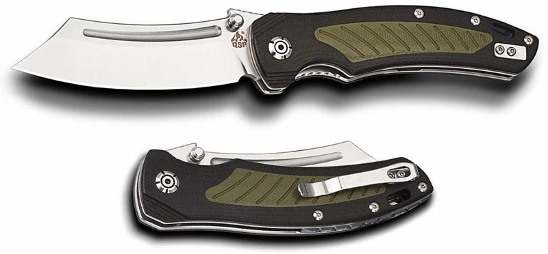 The QS123-A QSP Platypus Knife is an eye catching value price EDC that features a 3.75 inch modified reverse tanto (cutlass style!) blade made of Sandvik 14C28N stainless steel with a satin finish, a notched thumb rest for secure grip, a decorative fuller, and dual thumb studs for ambidextrous one hand opening. The stepped black G10 handle, 4.88 inches closed, has grooved green G10 inlays, ceramic ball bearing pivot for smooth opening, stainless steel liners and a contrasting notched blue titanium backspacer for strength, a sturdy liner lock, large lanyard hole, and a side to side reversible steel pocket clip mounted at the butt end. The QSP Platypus Knife has an overall open length of 8.63 inches, and it weighs 5.5 ounces. Made in China.