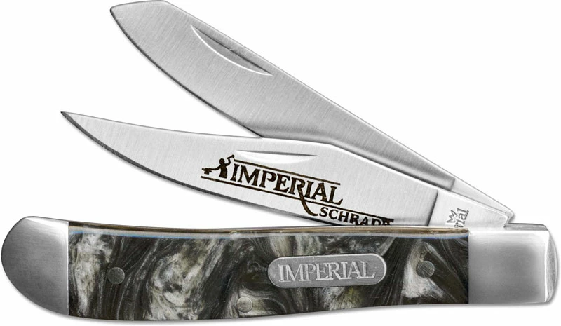 The illustrated Schrade Knife is the Schrade Imperial Mini Trapper Knife that features clip and spey blades made of 3Cr13 stainless steel with nail nicks for opening. The Olive Swirl celluloid handle of this Schrade knife, 3.5″ closed, has stainless steel liners, Imperial shield inlay and stainless steel bolsters. The Schrade Imperial Mini Trapper Knife with Olive Swirl celluloid handle weighs 2.5 ounces. Imported from China.