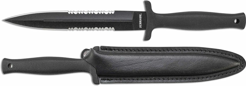 The illustrated Schrade knife is the Schrade Needle Boot Knife that features a 7.6″ double edge spear point blade made of 7Cr17MoV stainless steel. The blade of this Schrade knife has double serrations, a non reflective black coat and a fuller. The Needle Boot Knife has a black textured TPE overmolded handle with integral cross guard for secure grip, and a lanyard hole. A leather sheath with boot / belt clip is included with this Schrade knife. The Schrade Needle Boot Knife has an overall length of 12.7″, and it weighs 5.1 ounces.