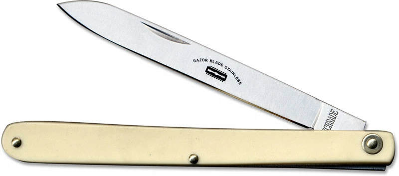 The illustrated Schrade Knife is the Schrade Sampler Knife that features a razor blade made of stainless steel. The pale yellow handle of this Schrade knife, 4 11/16″ closed, has brass liners. This Schrade Sampler Knife is imported.